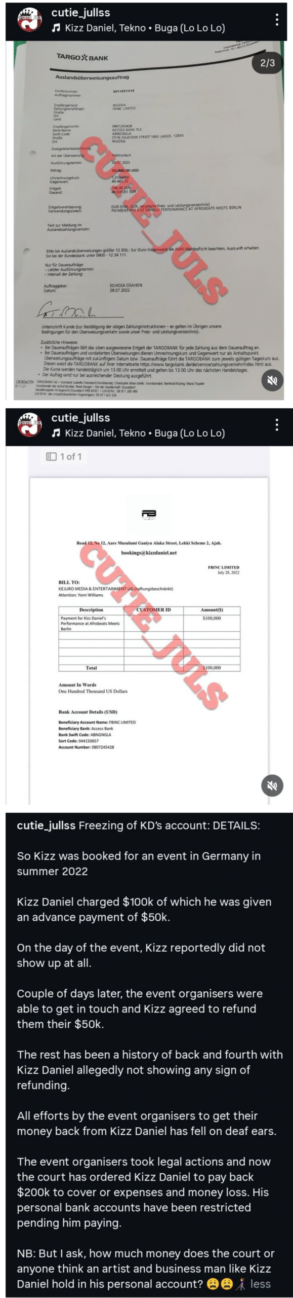 Cutie Juls reports that Kizz Daniel was booked for an event in Germany in 2022 and charged $100,000, but was paid half of his fee .
