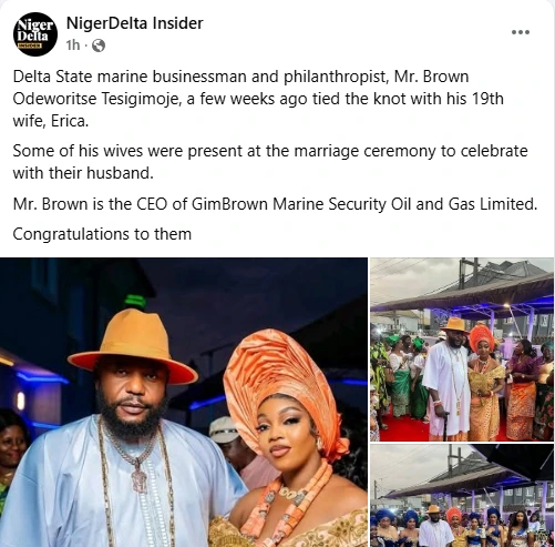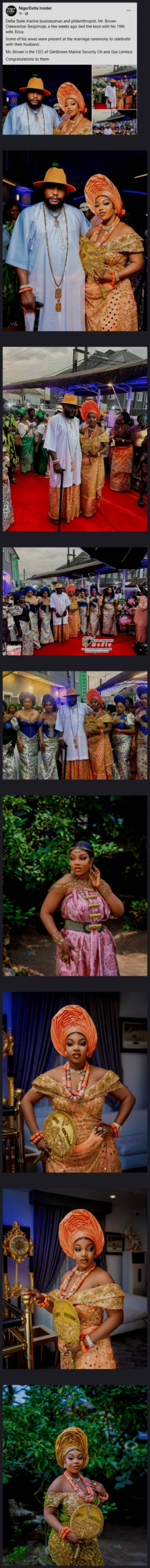 Delta State billionaire businessman and philanthropist, Brown Odeworitse Tesigimoje, recently married his 19th wife, Erica.