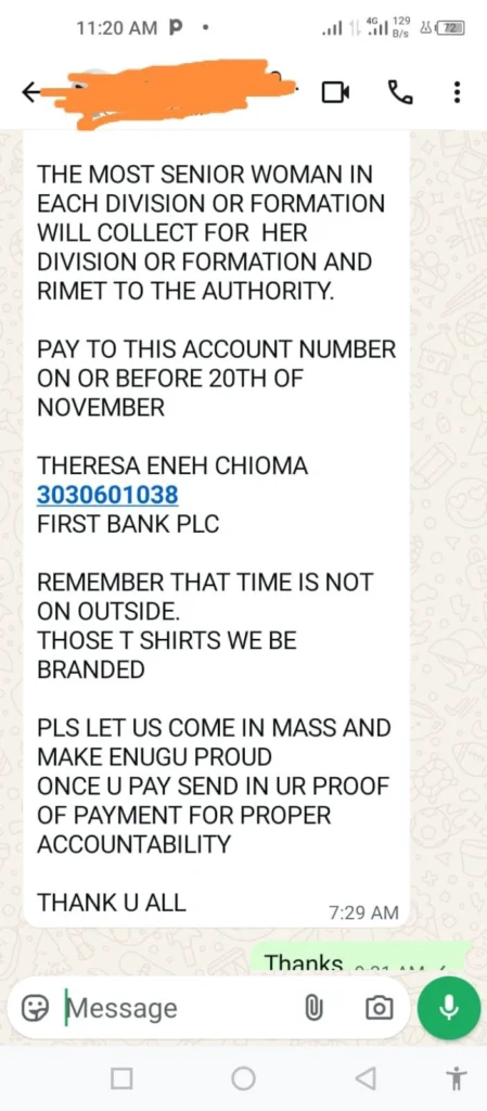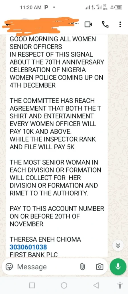 On Sunday, November 23, SaharaReporters published an exclusive report that senior female officers in Enugu circulated a “memo” via WhatsApp demanding payment for branded T-shirts and entertainment for the December 4 anniversary celebration.
