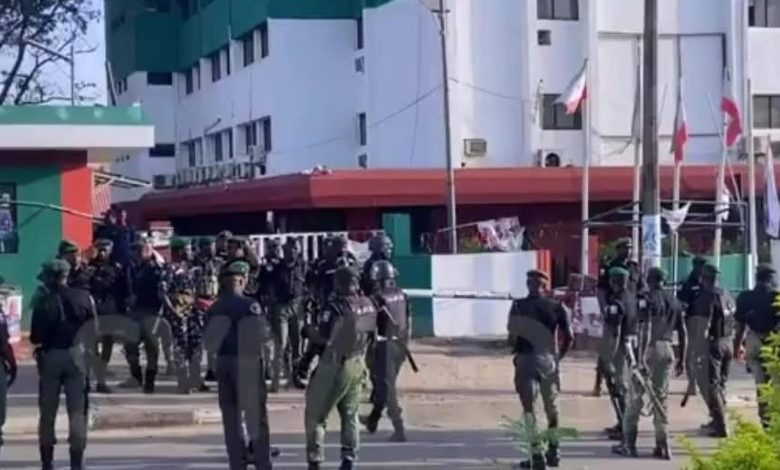 Armed policemen and their vehicles were seen at the venue on Tuesday morning, raising tensions within the opposition party following days of intensified internal wrangling.