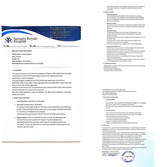 According to BluePrint, the medical report issued by Serenity Royale Hospital in Abuja and signed by its Managing Director/Head of Clinical Services, Dr. Adekunle Adesina, revealed that the movie star has been battling severe substance abuse and has been undergoing a detoxification programme from September 9 to October 15, 2025.