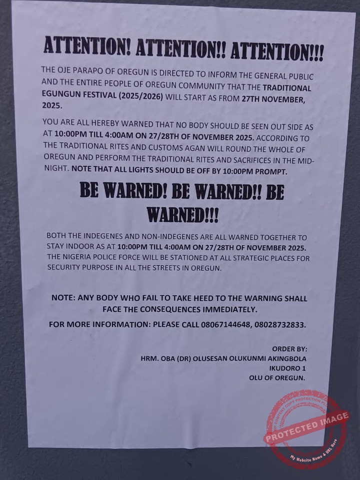 A public notice signed by HRM Oba (Dr) Olusesan Olukunmi Akingbola, Ikudoro I — the Olu of Oregun, orders that no one must be seen outside from 10:00 p.m. to 4:00 a.m. on the nights of 27th and 28th November 2025… Read Original / Full Content