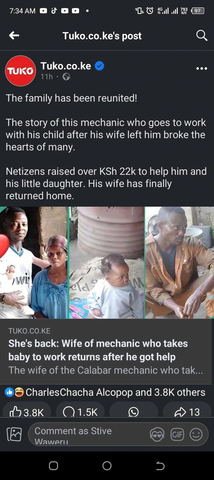 James Emina, who had been raising his 7-month-old daughter Blessing alone at his mechanic workshop, has finally been reunited with his wife.